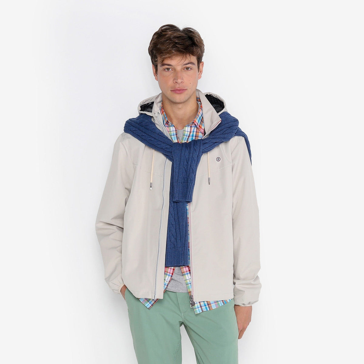 - Capuche escamotable dans le col avec cordons de serrage et embouts métal