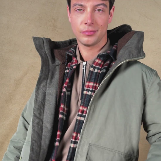 - Diseño clásico: estampado de cuadros oscuros y discretos, mangas largas y bajo recto.